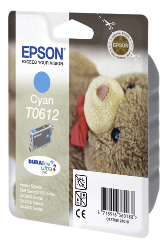El producto «Cartucho de tinta cian Epson Original T061240 para Stylus D68/D88/DX3800/DX4200/DX480...» de Epson, la tinta de impresión es cian, tiene unas dimensiones de alto x ancho x profundidad 31 mm. El producto tiene un peso de 62 g.