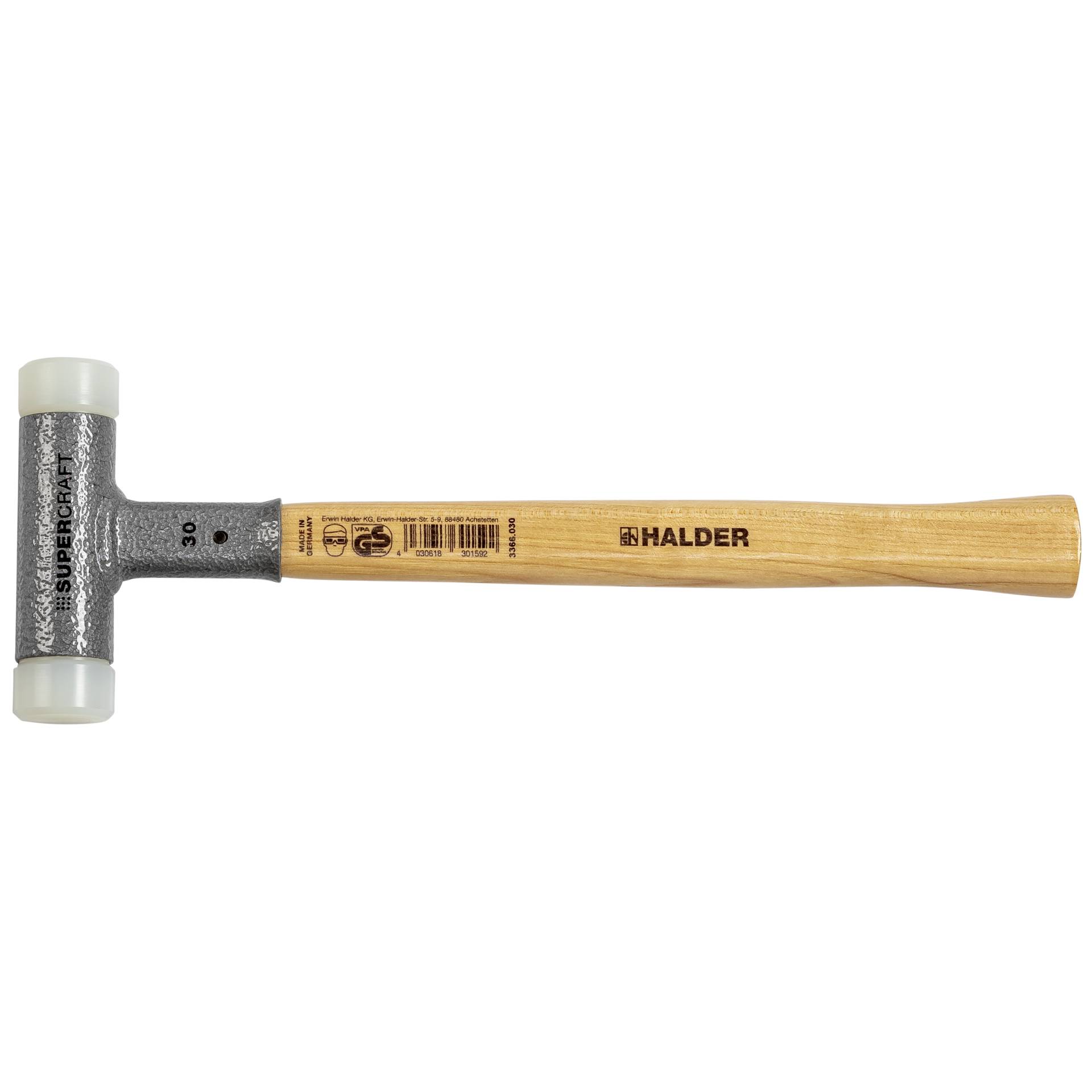 HALDER Schonhammer Supercraft Kopf-D.30mm Hickory rückschlagfrei hart Nyl. weiß HALDER (3366.030)